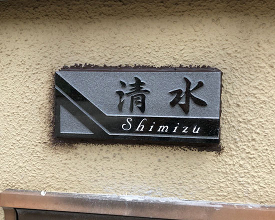 表札裏面よりステンレスのボルト(直径6mm)を出します。取付面に穴をあけ、ボルトを穴に差し込みながら接着します。